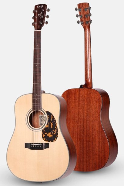 กีต้าร์โปร่ง SAGA D10S ( Solid Top ) SPECIFICATIONS Body Shape : Dreadnought Top : Solid Sitka Spruce Back /Sides : Mahogany Neck : Okoume Bridge : Rosewood Binding : Black Pickguard : Brown Fingerboard : Rosewood Electronics : None Nut/Saddle : Natural Cow Bone Colour : Natural แถมฟรี กระเป๋า ปิ๊ก ประแจขันคอ ตารางคอร์ด เครื่องตั้งสาย สายสะพาย และรับประกัน 1 ปี