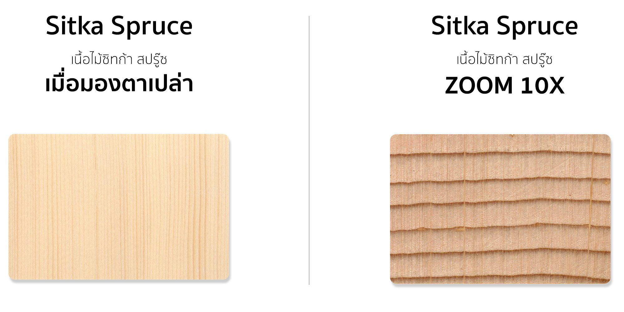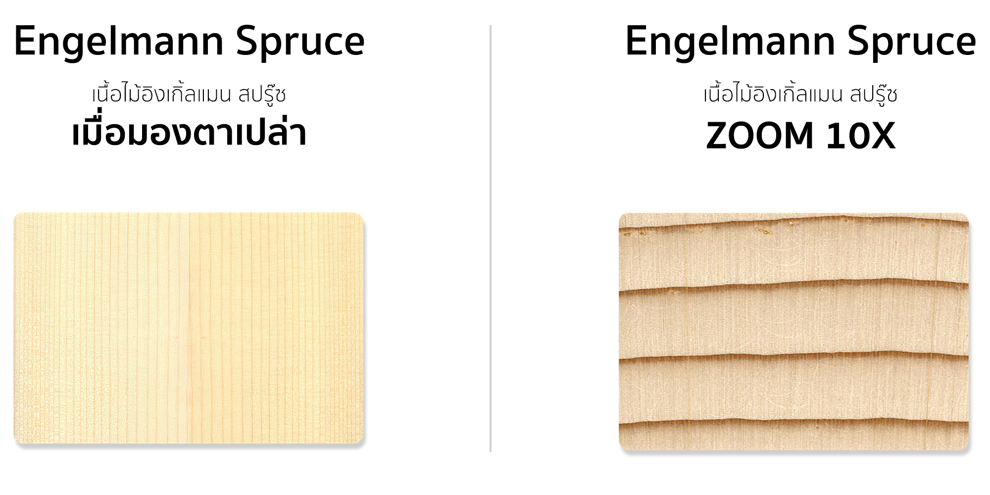 - ลายไม้/เนื้อสัมผัส : มีลายไม้ที่ตรงละเอียดสม่ำเสมอ แต่ลายจะถี่กว่าอิงเกิ้ลแมน สปรู๊ซ มีความแข็งแรงแต่มีน้ำหนักเบา